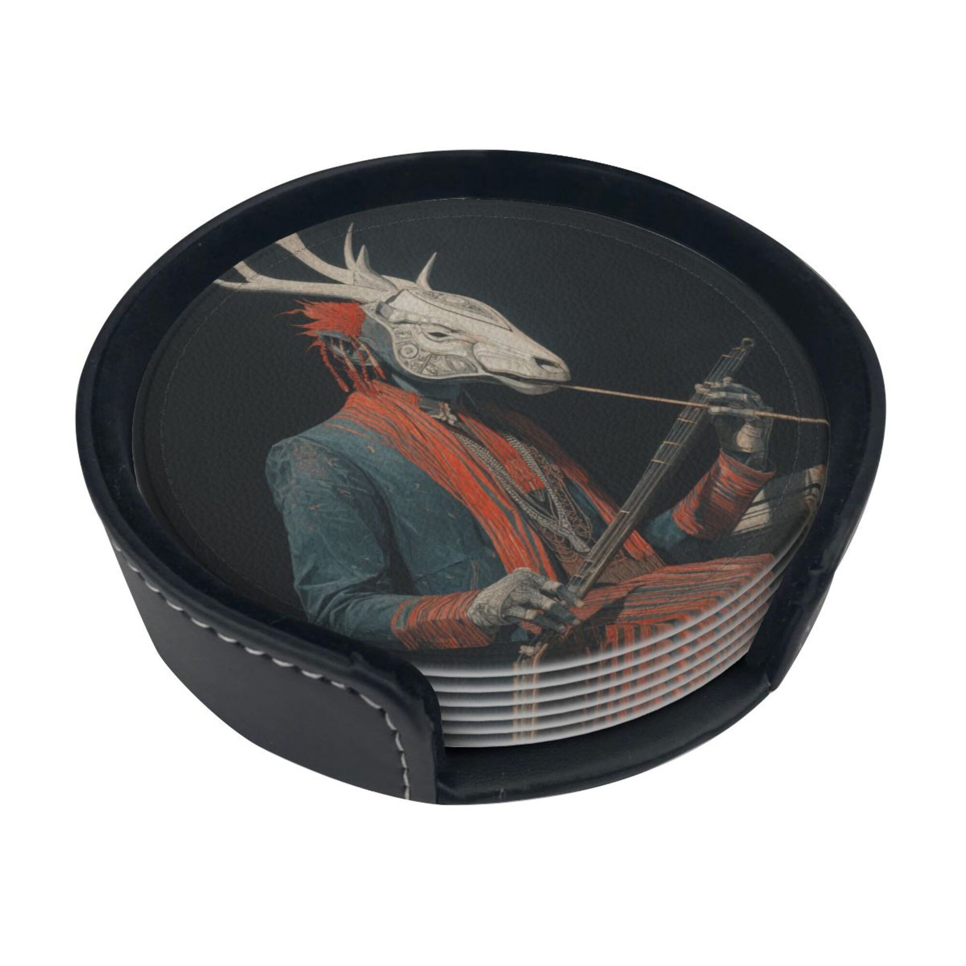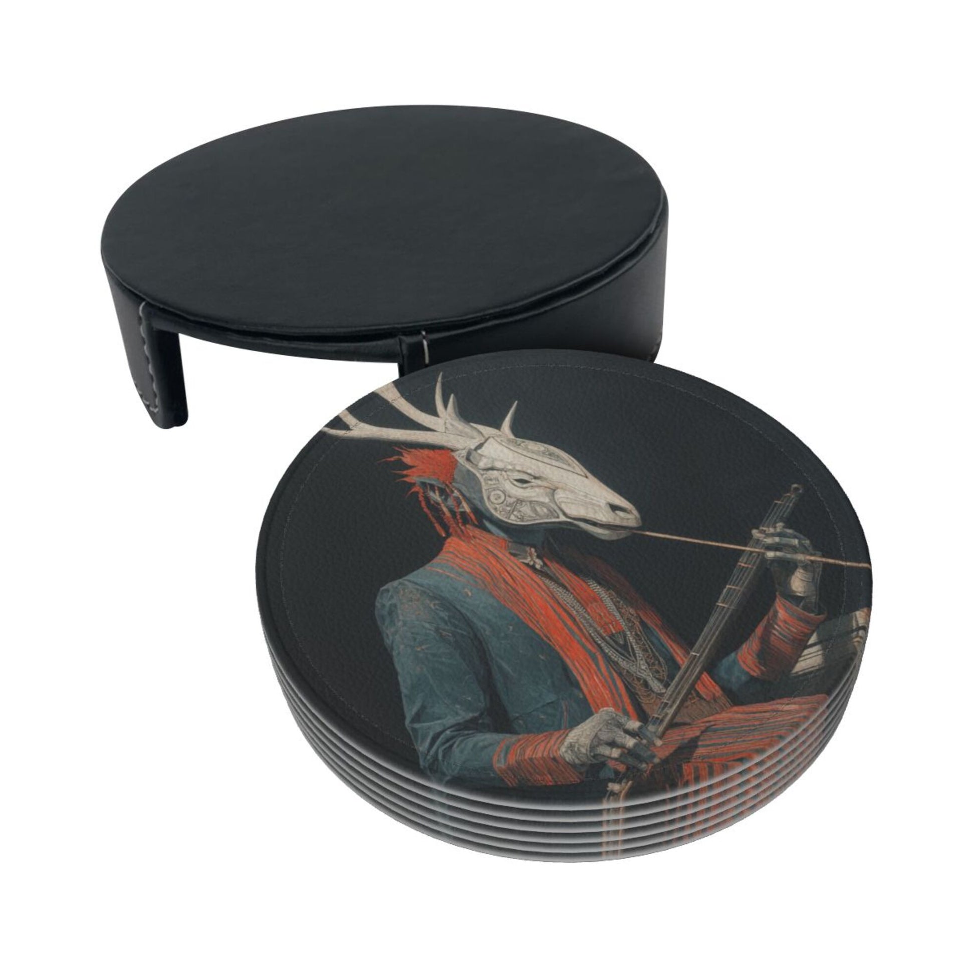 Artistic Deer - Head Figure Printed Round Leather Coasters (with Storage Tray, Size 10cm×0.3cm )