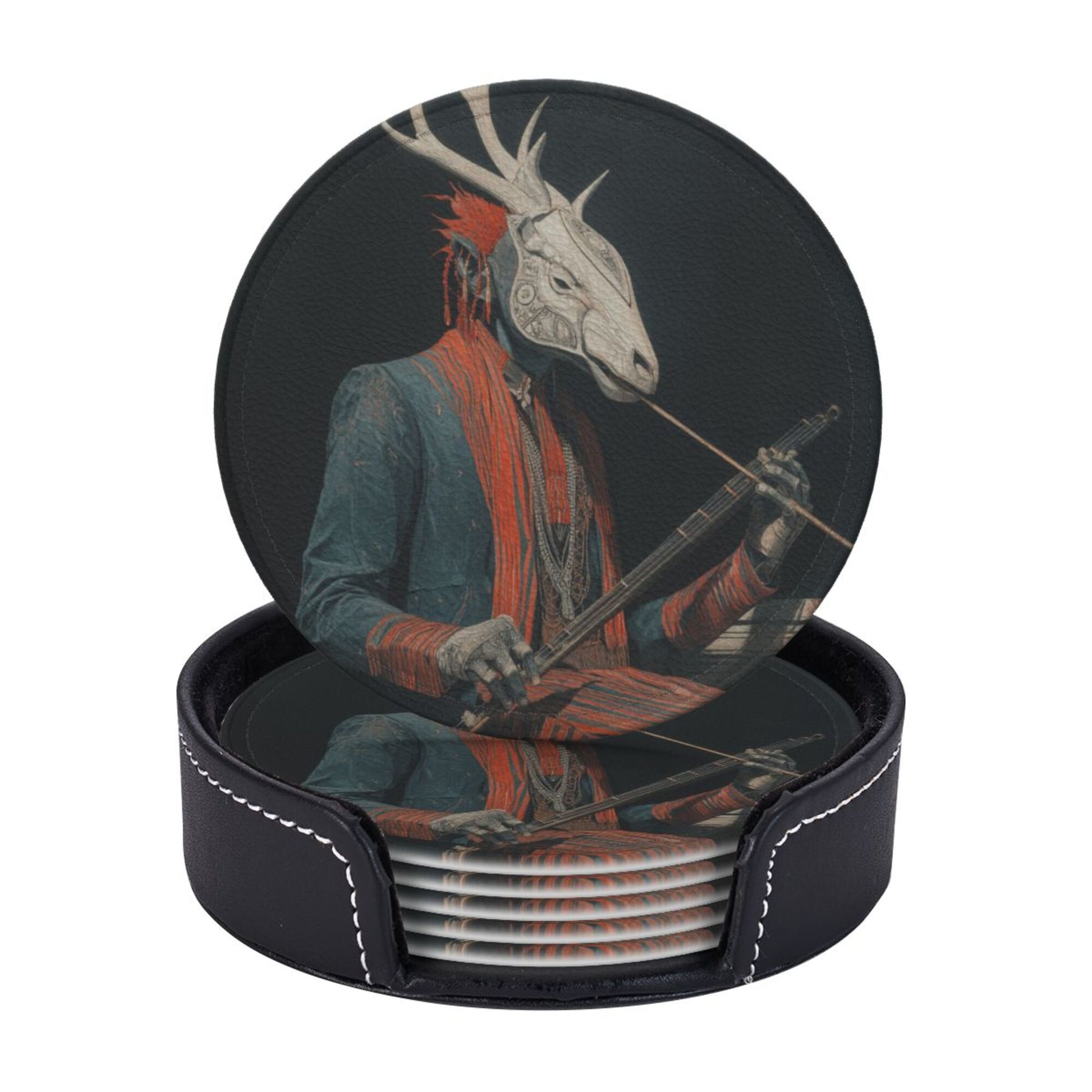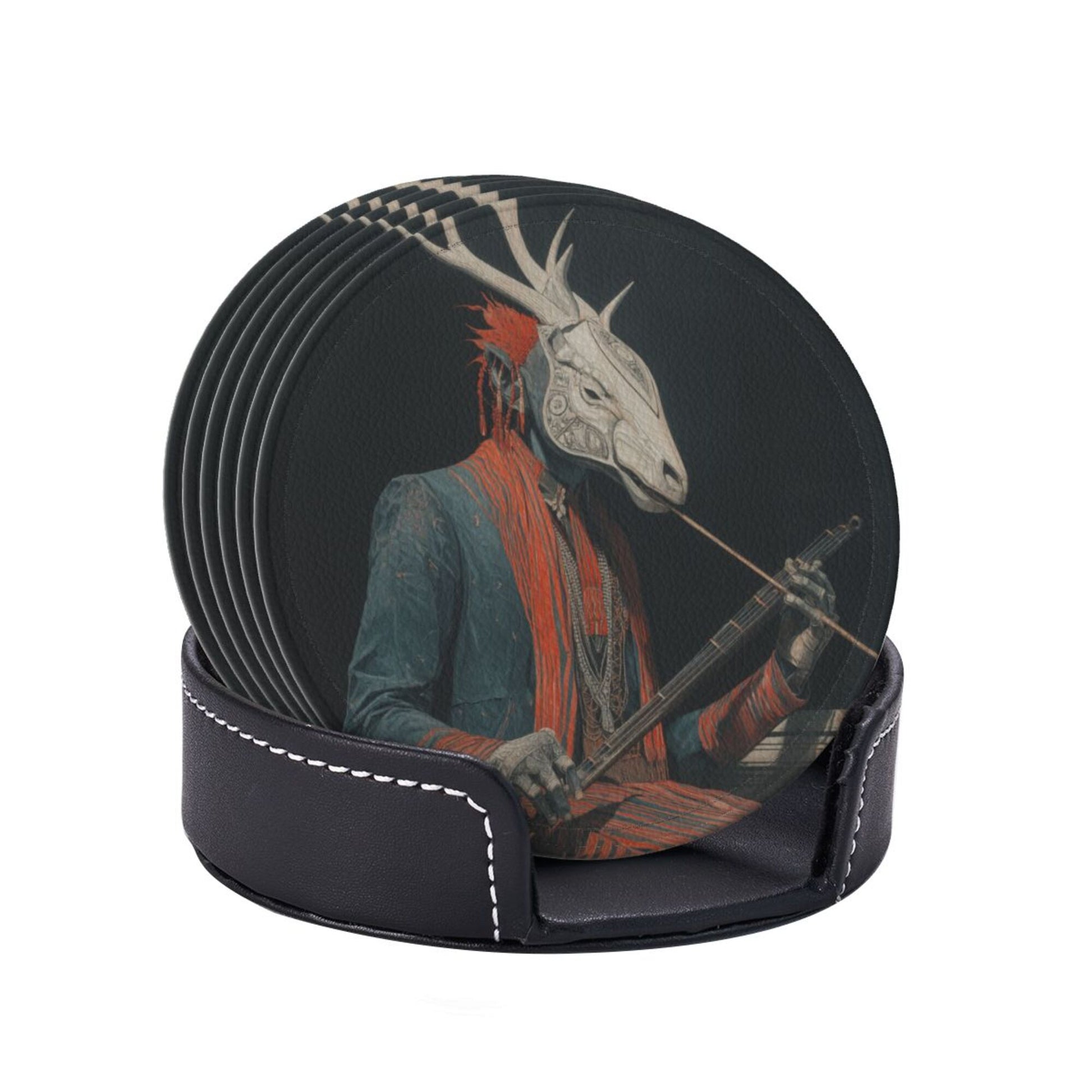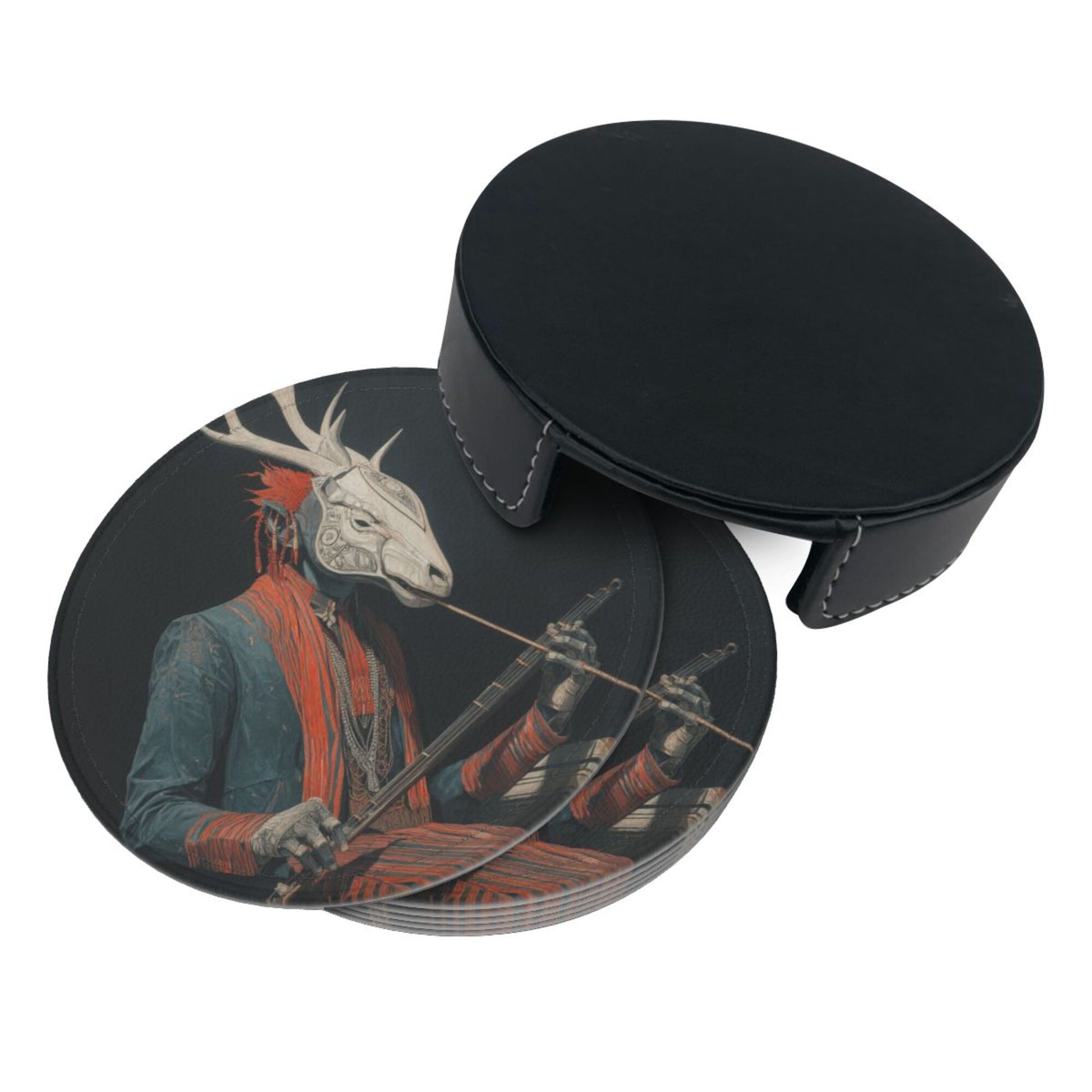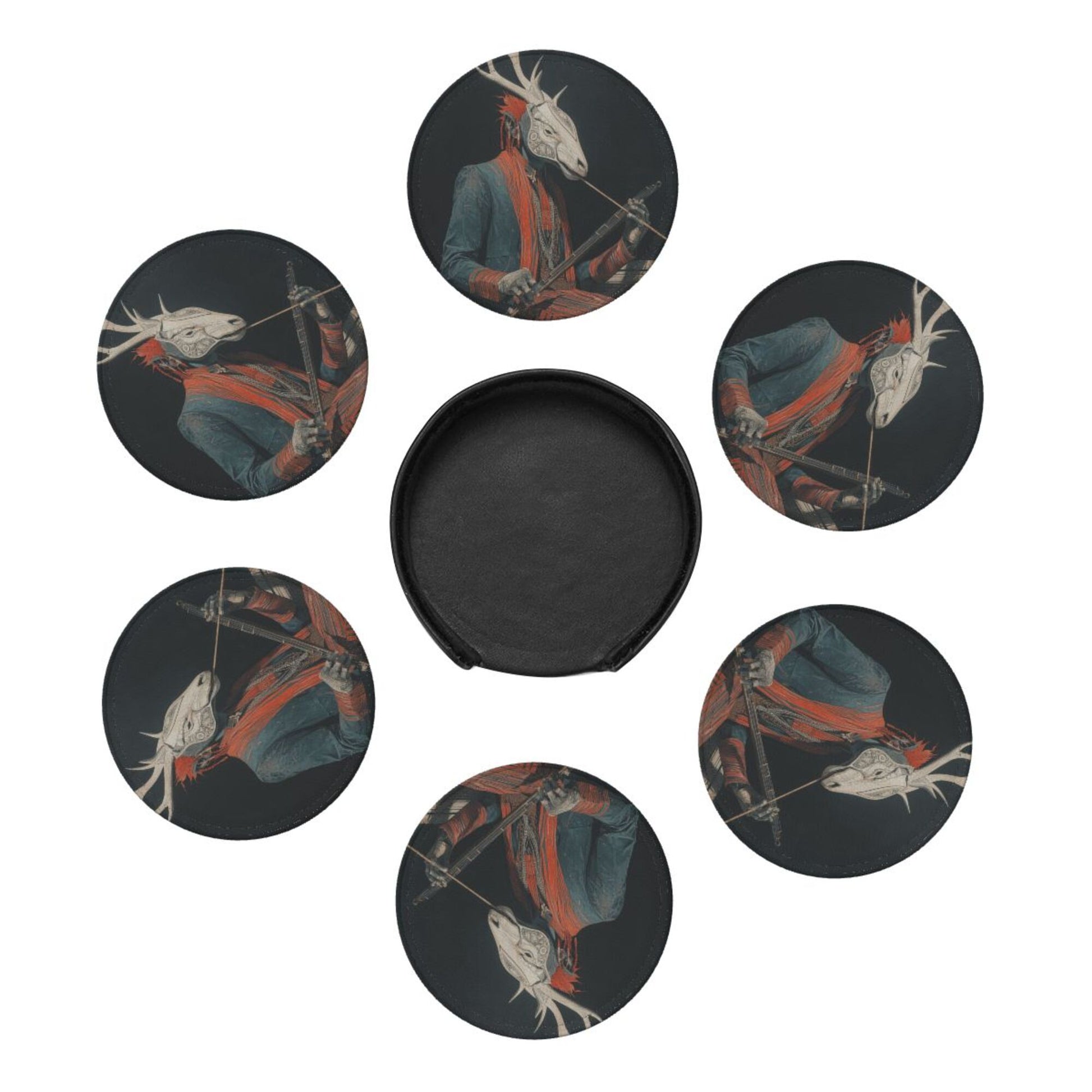 This round leather coaster skillfully combines artistic illustrations with practical functions. Each coaster has a diameter of 3.9 inches (about 10cm) and a thickness of only 0.12 inches (about 0.3cm). It is thin and small, suitable for various common wine glasses and water cups, and can be placed stably without slipping, effectively protecting the desktop from water stains and scratches. The surface of the coaster is printed with a unique deer - head figure pattern, which is mysterious and artistic. The dark background is matched with vivid colors, and the details are exquisite, adding a personalized atmosphere to the dining table and bar counter. Made of high - quality leather material, it has a delicate touch and strong toughness. The edges are finely processed, not easy to wear and deform, and can still maintain beauty after long - term use. The set is also equipped with a black storage tray of the same material. When not in use, the coasters can be neatly stored, saving space and being easy to carry. Whether it is for daily use to enhance the quality of life or as a gift for art lovers, it is a unique choice.