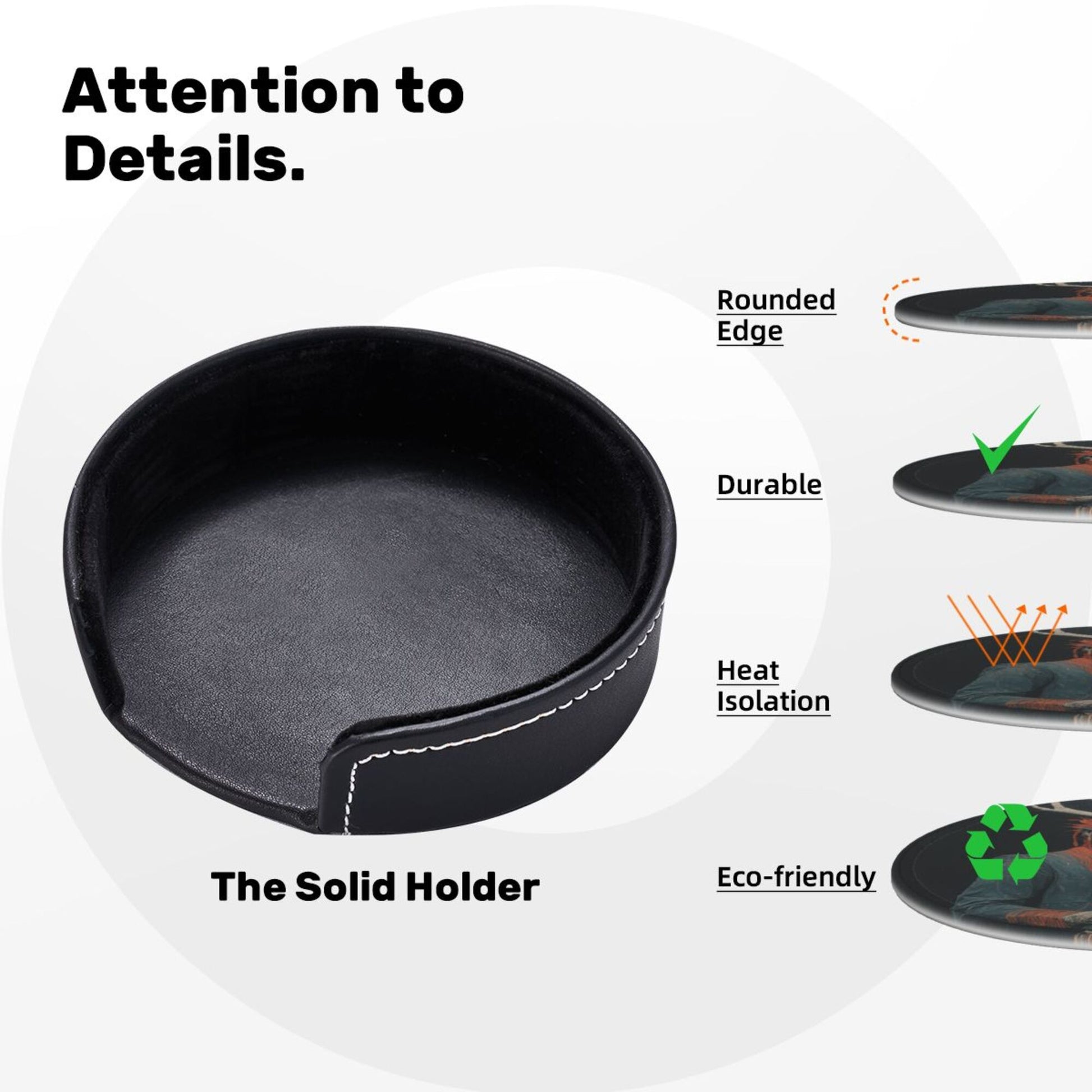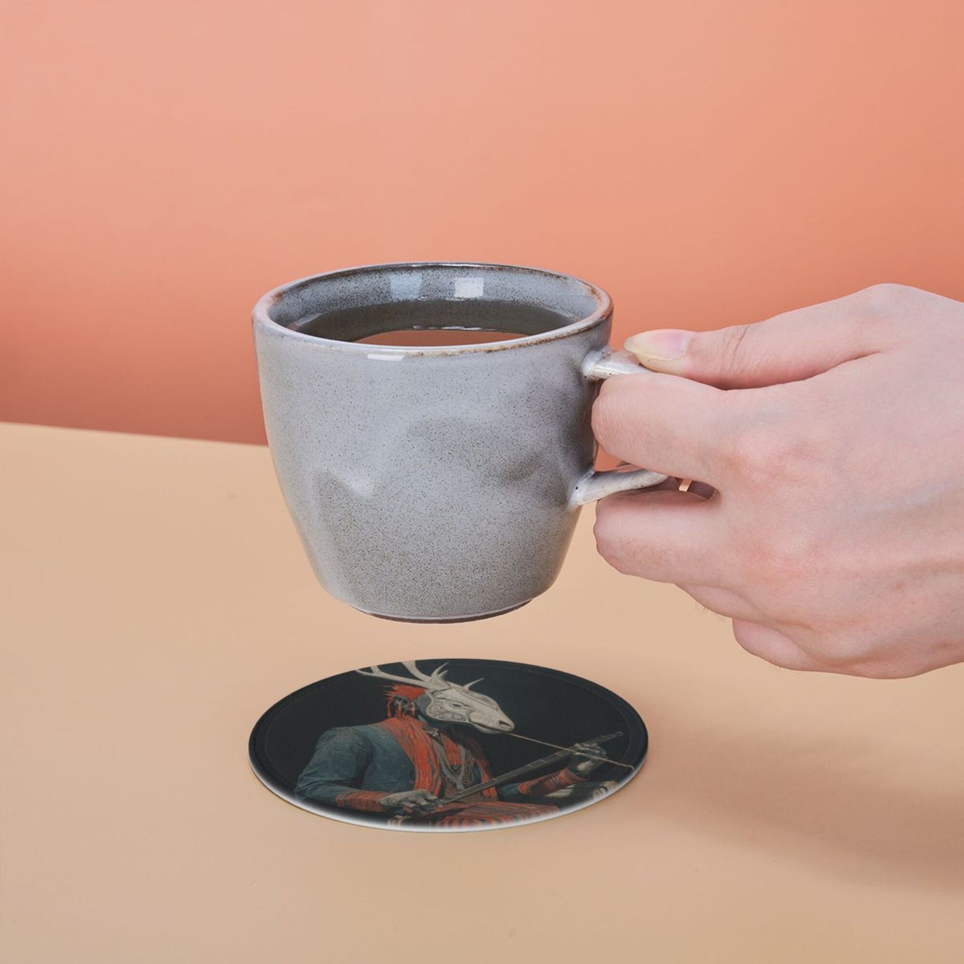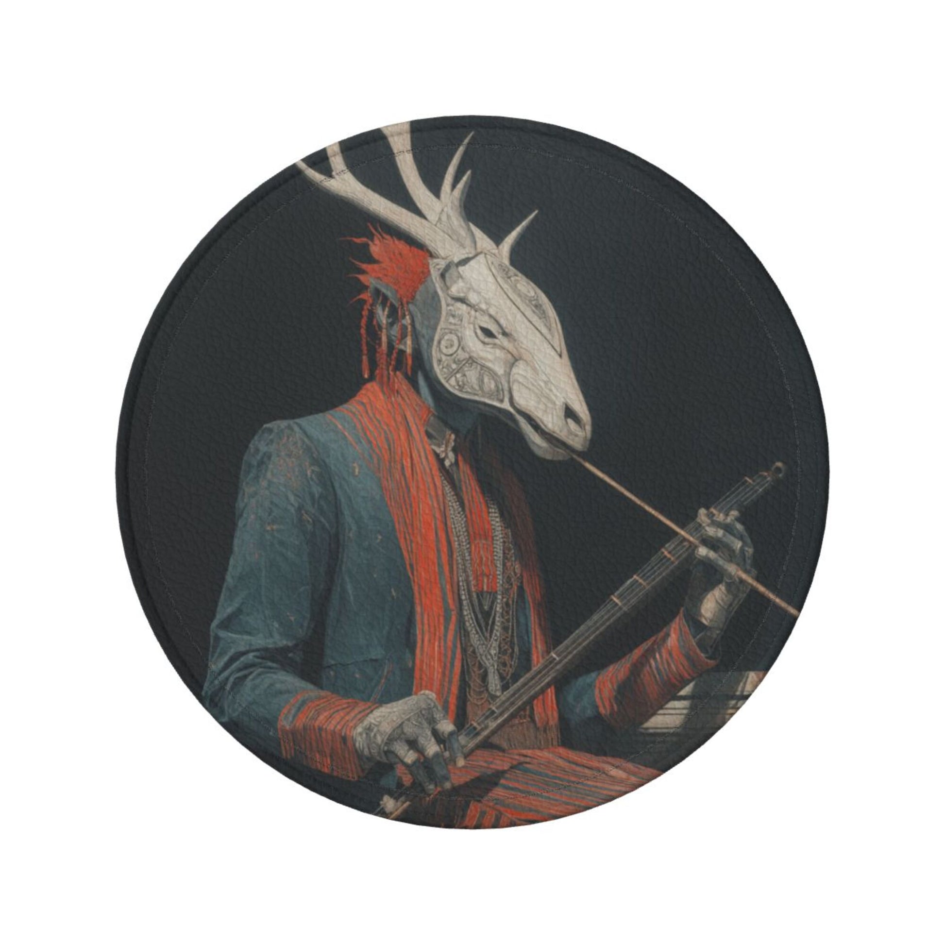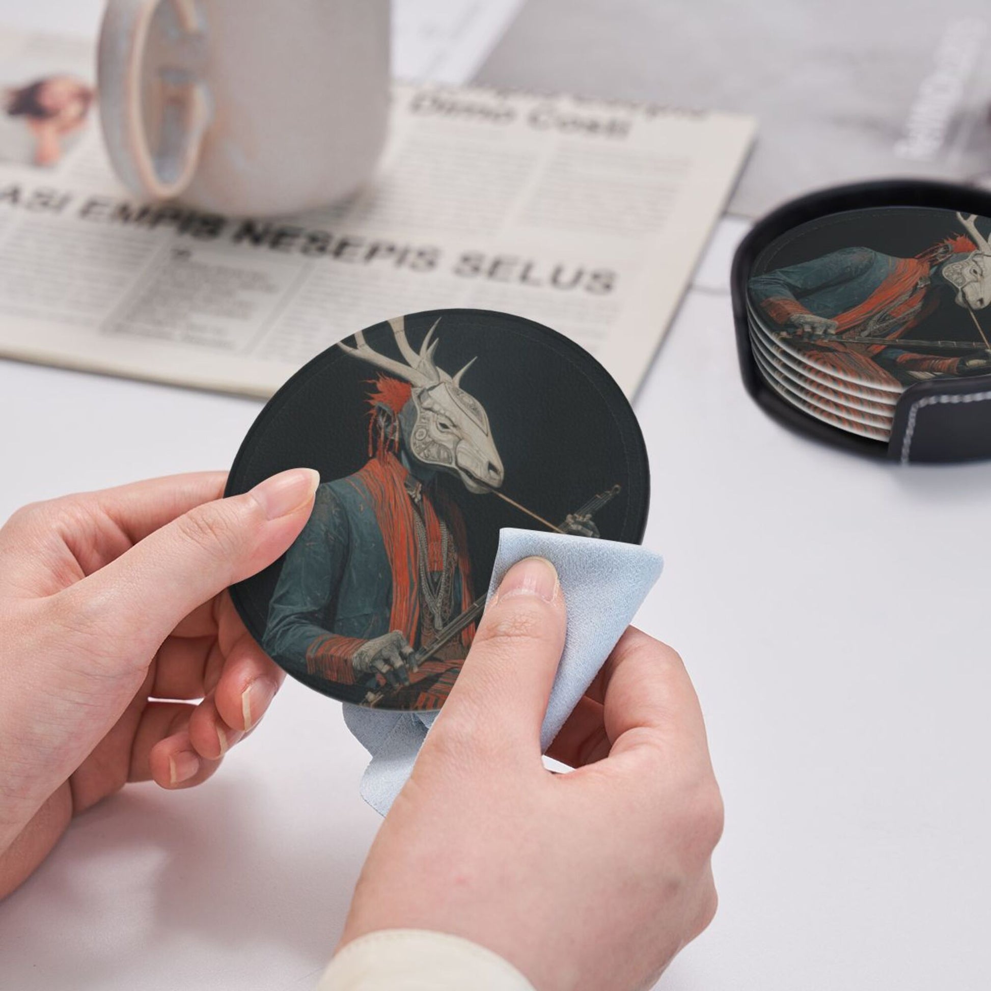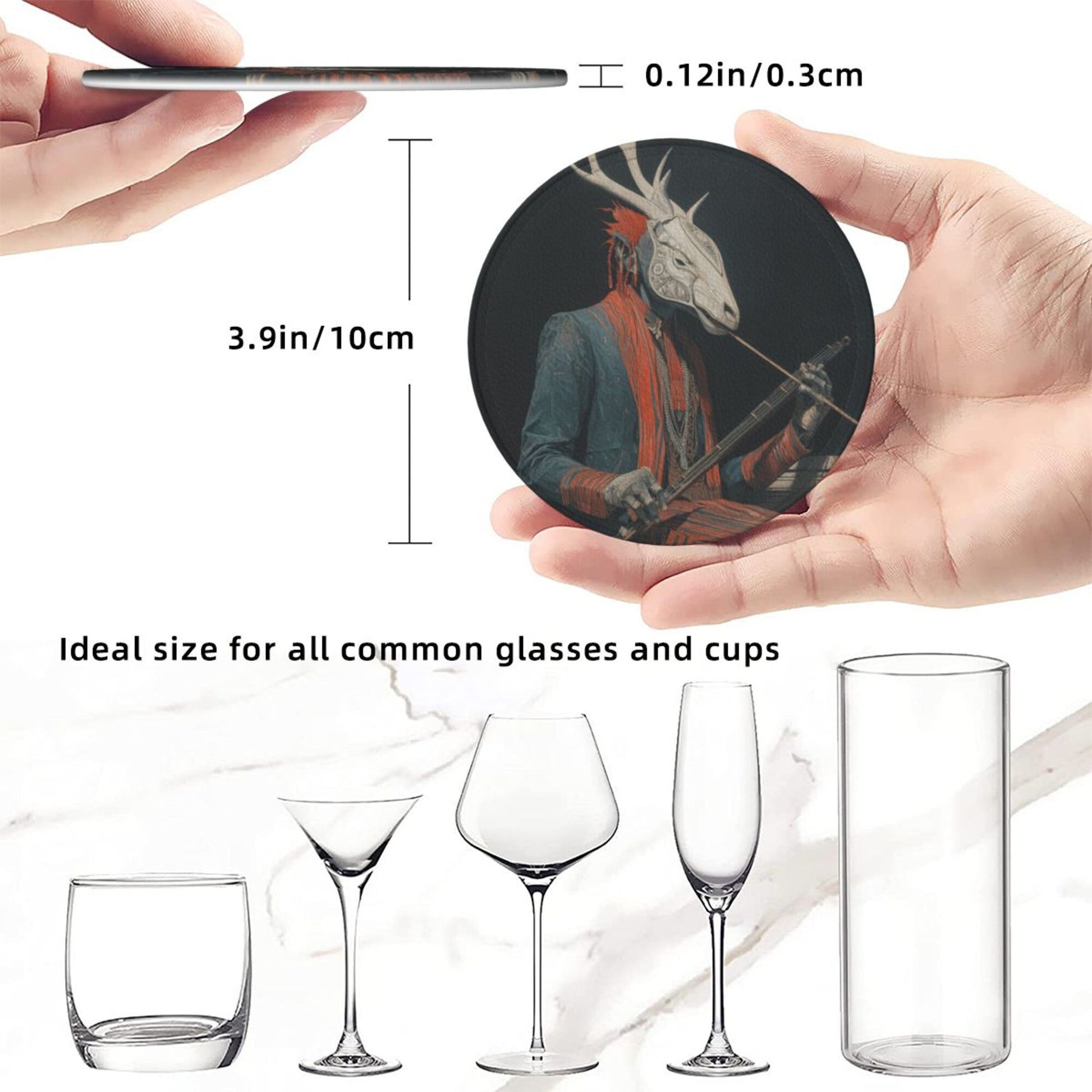 This round leather coaster skillfully combines artistic illustrations with practical functions. Each coaster has a diameter of 3.9 inches (about 10cm) and a thickness of only 0.12 inches (about 0.3cm). It is thin and small, suitable for various common wine glasses and water cups, and can be placed stably without slipping, effectively protecting the desktop from water stains and scratches. The surface of the coaster is printed with a unique deer - head figure pattern, which is mysterious and artistic. The dark background is matched with vivid colors, and the details are exquisite, adding a personalized atmosphere to the dining table and bar counter. Made of high - quality leather material, it has a delicate touch and strong toughness. The edges are finely processed, not easy to wear and deform, and can still maintain beauty after long - term use. The set is also equipped with a black storage tray of the same material. When not in use, the coasters can be neatly stored, saving space and being easy to carry. Whether it is for daily use to enhance the quality of life or as a gift for art lovers, it is a unique choice.