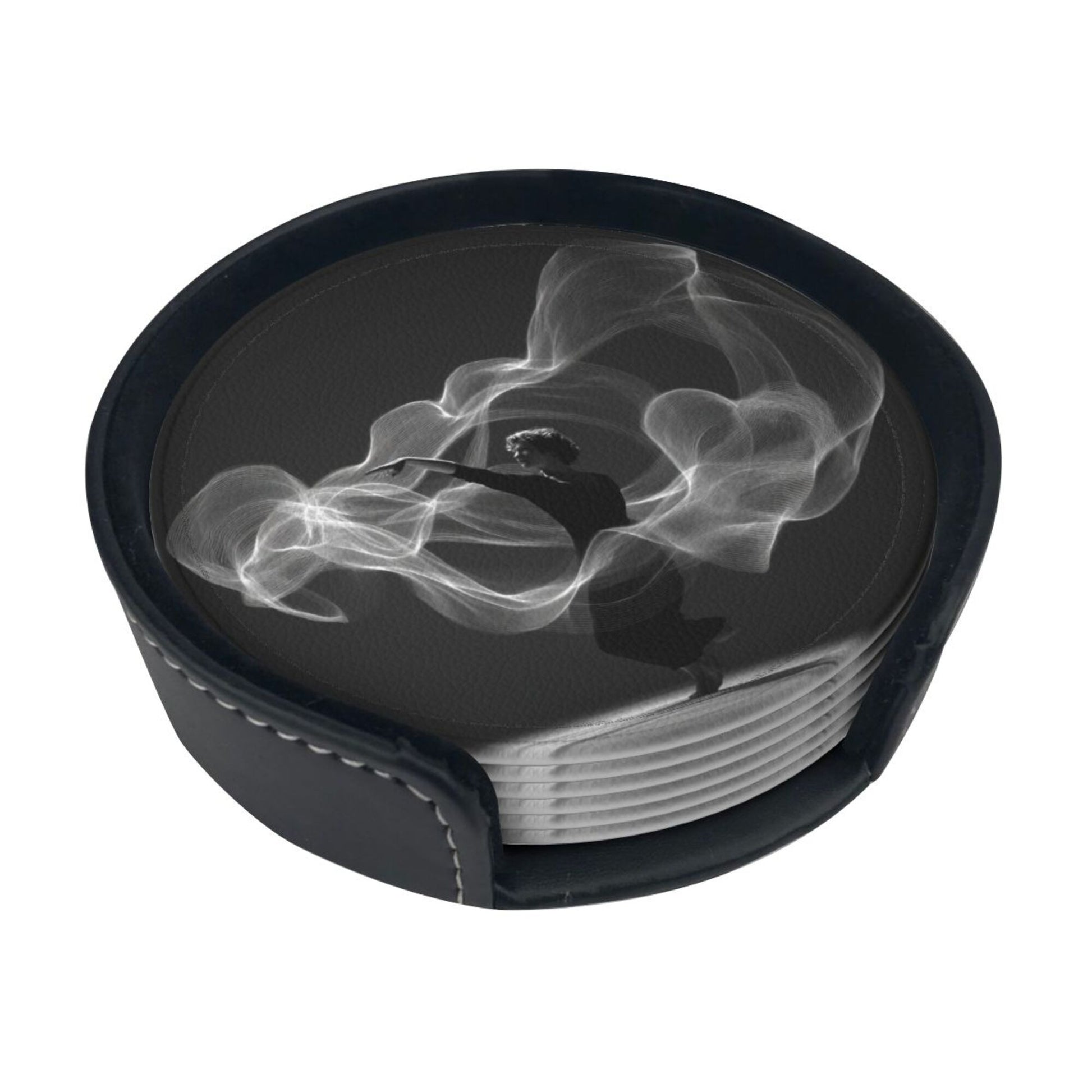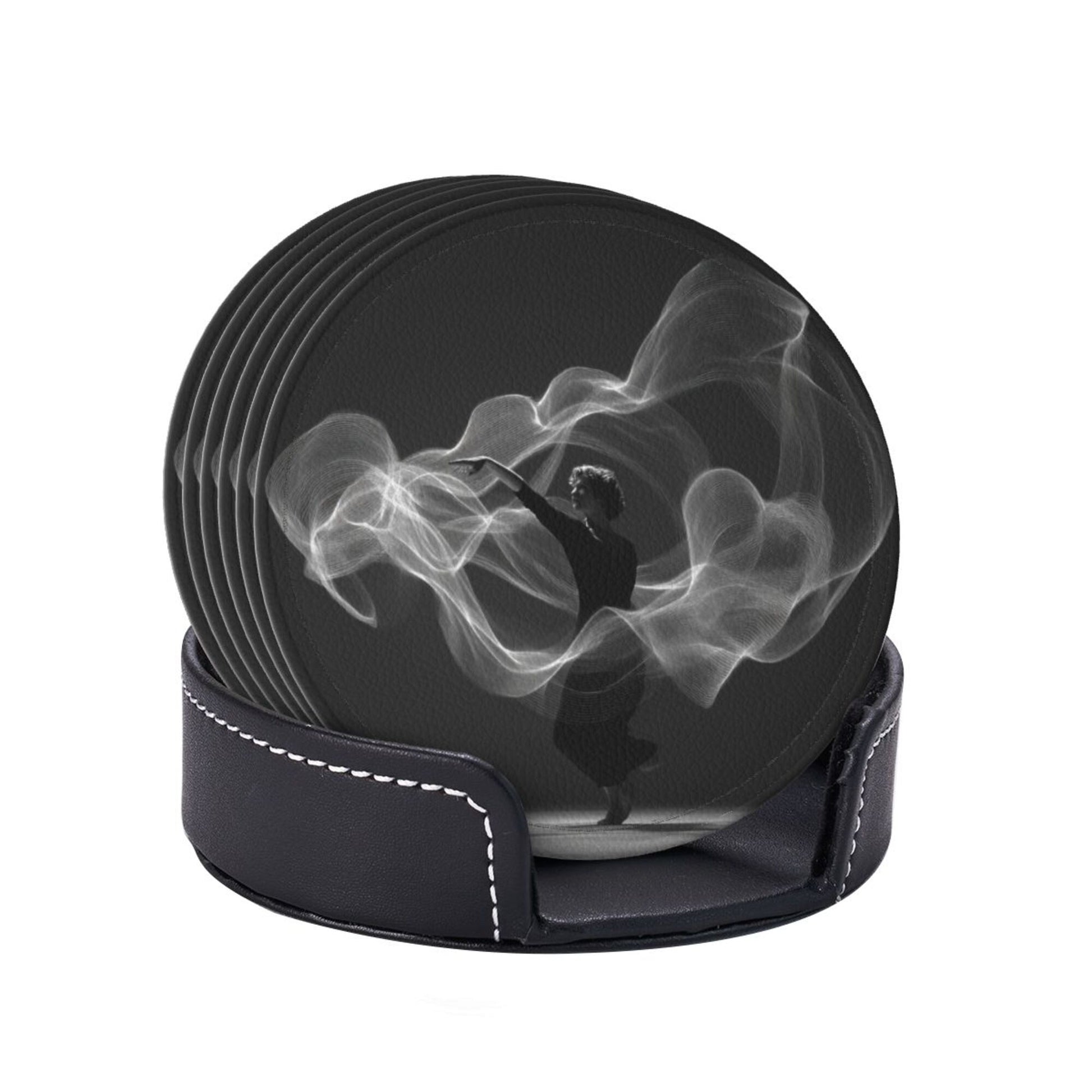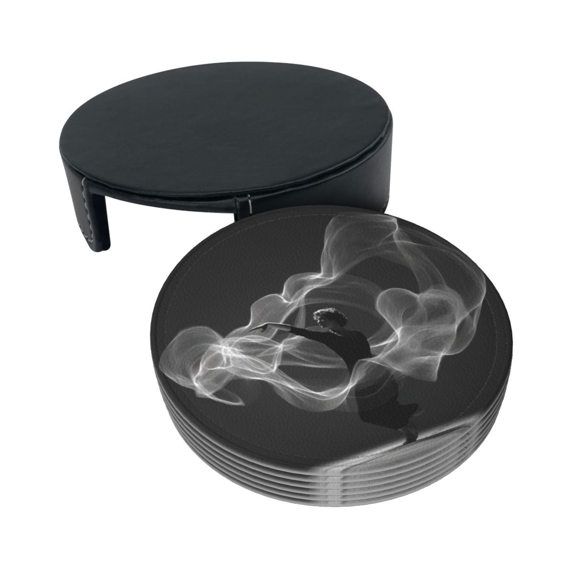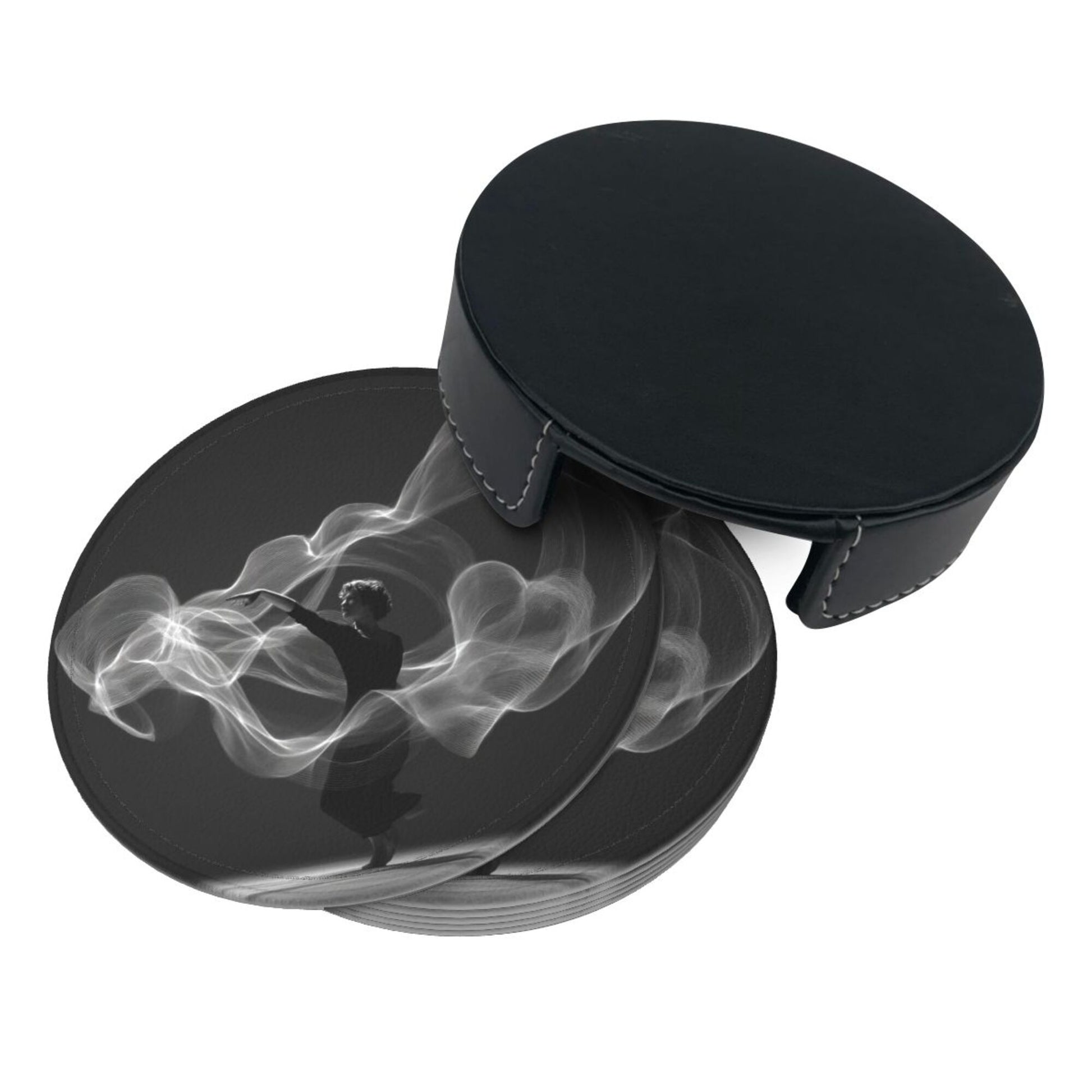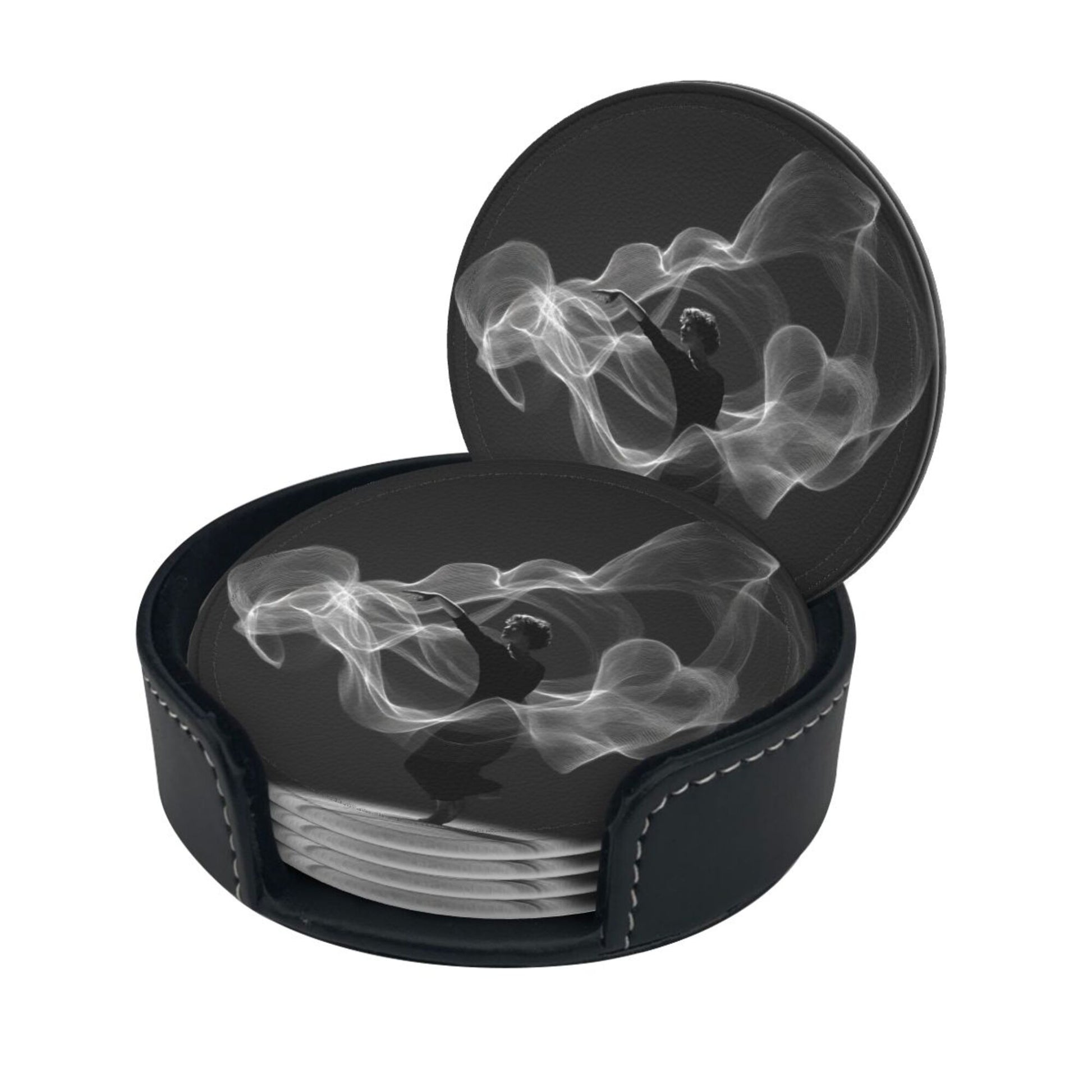 Artistic Smoke Dancer Round Leather Coaster Set - Creative Non - Slip Heat - Resistant Coasters (With Storage Tray, Diameter 10cm)