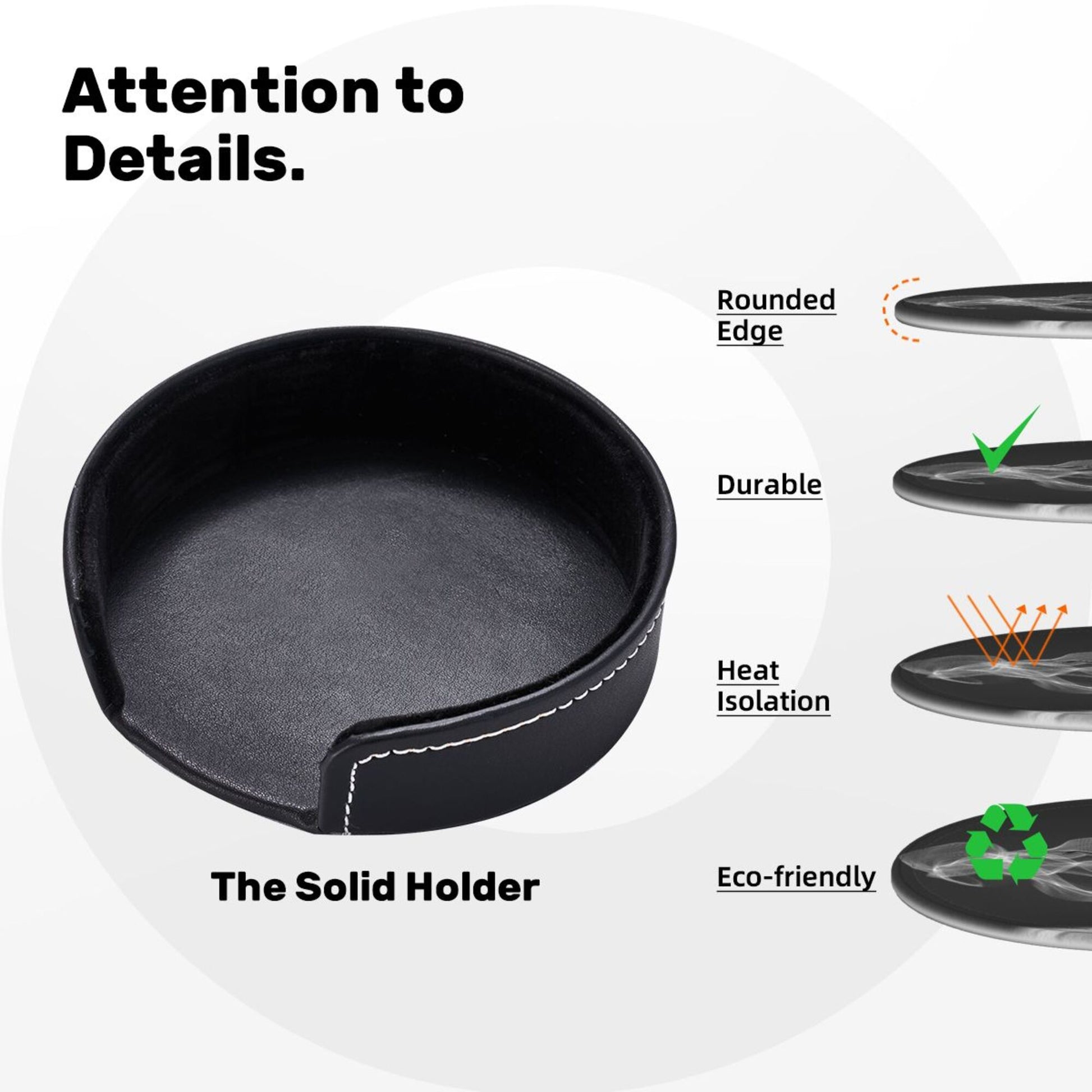 Set Configuration:It includes 6 coasters with the same pattern + 1 black leather storage tray. In daily use, they can be scattered to protect different areas of the tabletop; when not in use, the coasters are neatly stored in the tray, saving space and looking tidy, easily coping with scenarios such as family dinners, friends’ gatherings, and daily office use, meeting the protection needs of multiple tablewares.