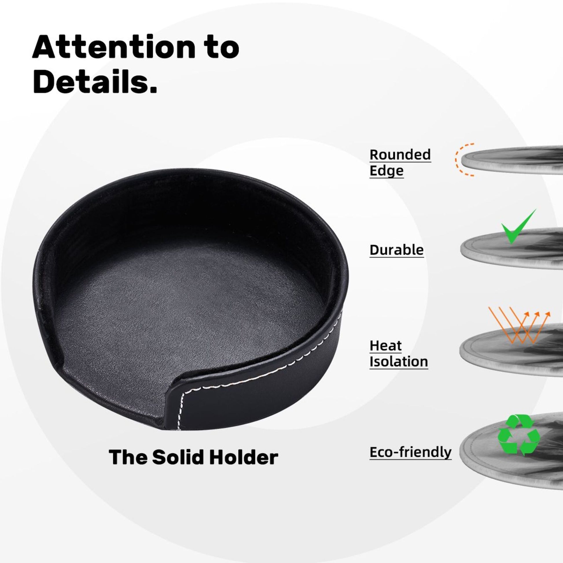 Set Configuration:It includes 6 coasters with the same pattern + 1 black leather storage tray. In daily use, they can be scattered to protect different areas of the tabletop; when not in use, the coasters are neatly stored in the tray, saving space and looking tidy, easily coping with scenarios such as family dinners, friends’ gatherings, and daily office use, meeting the protection needs of multiple tablewares.