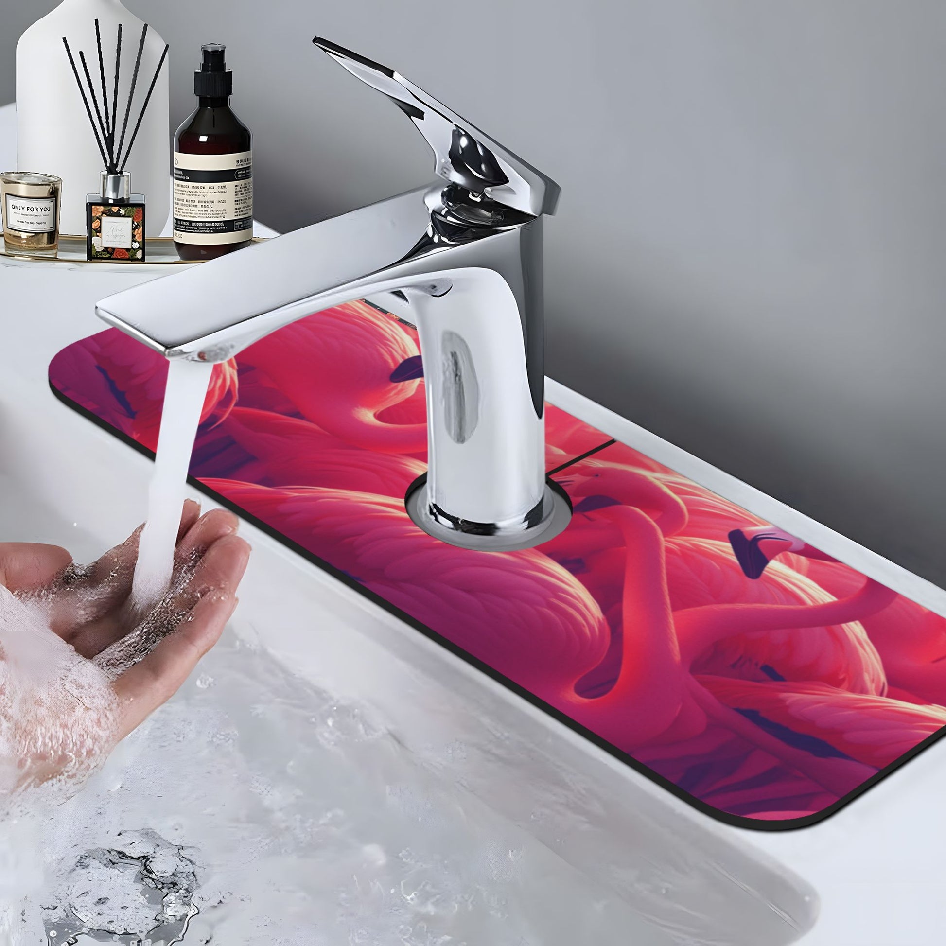 In terms of material, the surface layer is a leather - like fabric, waterproof and dirt - resistant. Daily splashes and stains can be cleaned with a gentle wipe; the middle layer is diatom foam, with super strong water absorption. When water droplets fall on it, they are quickly absorbed within a few seconds, effectively preventing water stains from penetrating and soiling the countertop; the bottom layer is made of rubber, anti - slip and stable. After laying, it firmly “sticks” to the countertop, not easy to slide or shift, protecting the countertop clean and safe. Installation is super easy, just slip it under the faucet. When washing dishes or washing up, it intercepts water splashes in time, keeping the countertop dry. Moreover, it's washable. When dirty, throw it into water for rinsing, and it can be used again after drying, practical and environmentally friendly, making the sink area always filled with the enthusiasm and beauty brought by flamingos.