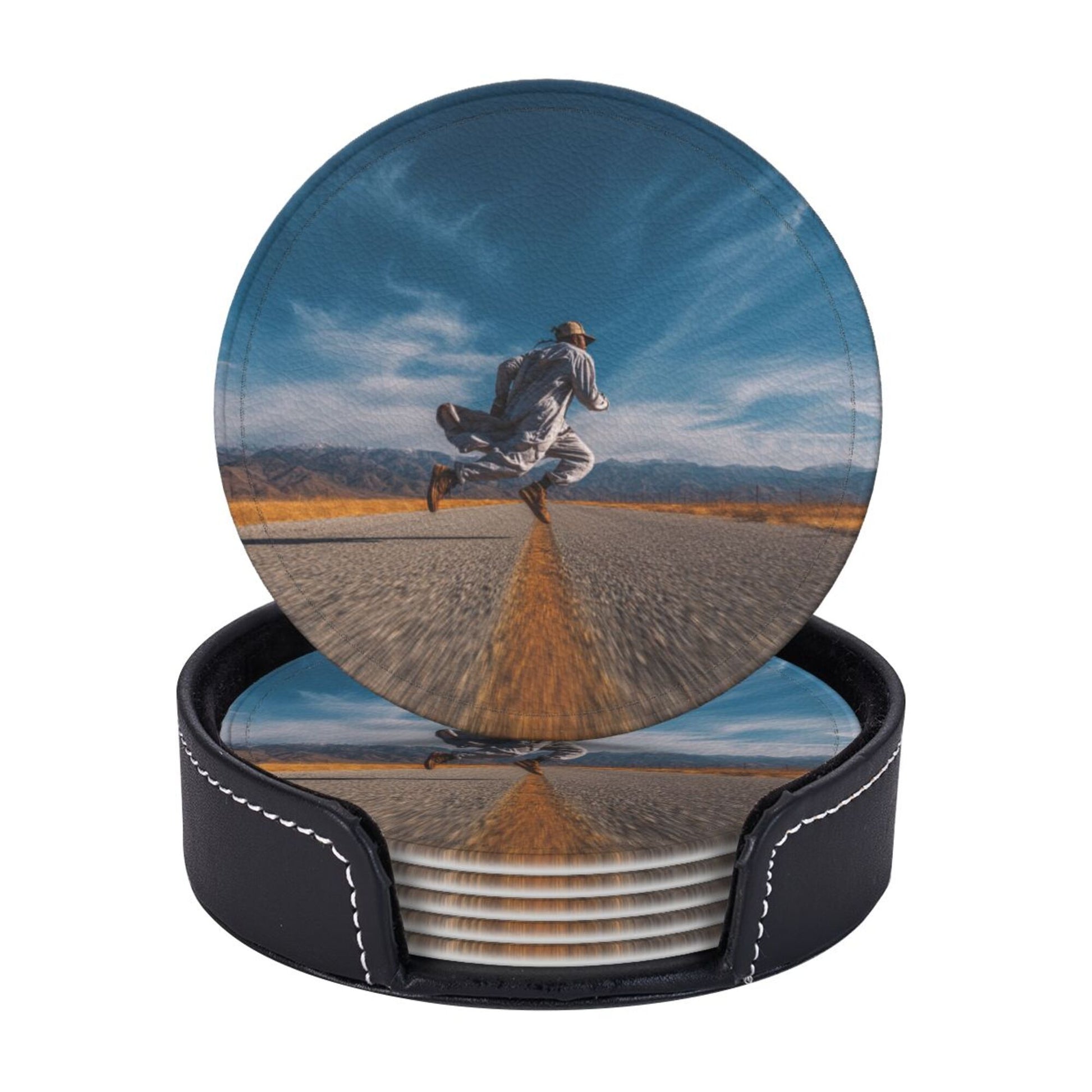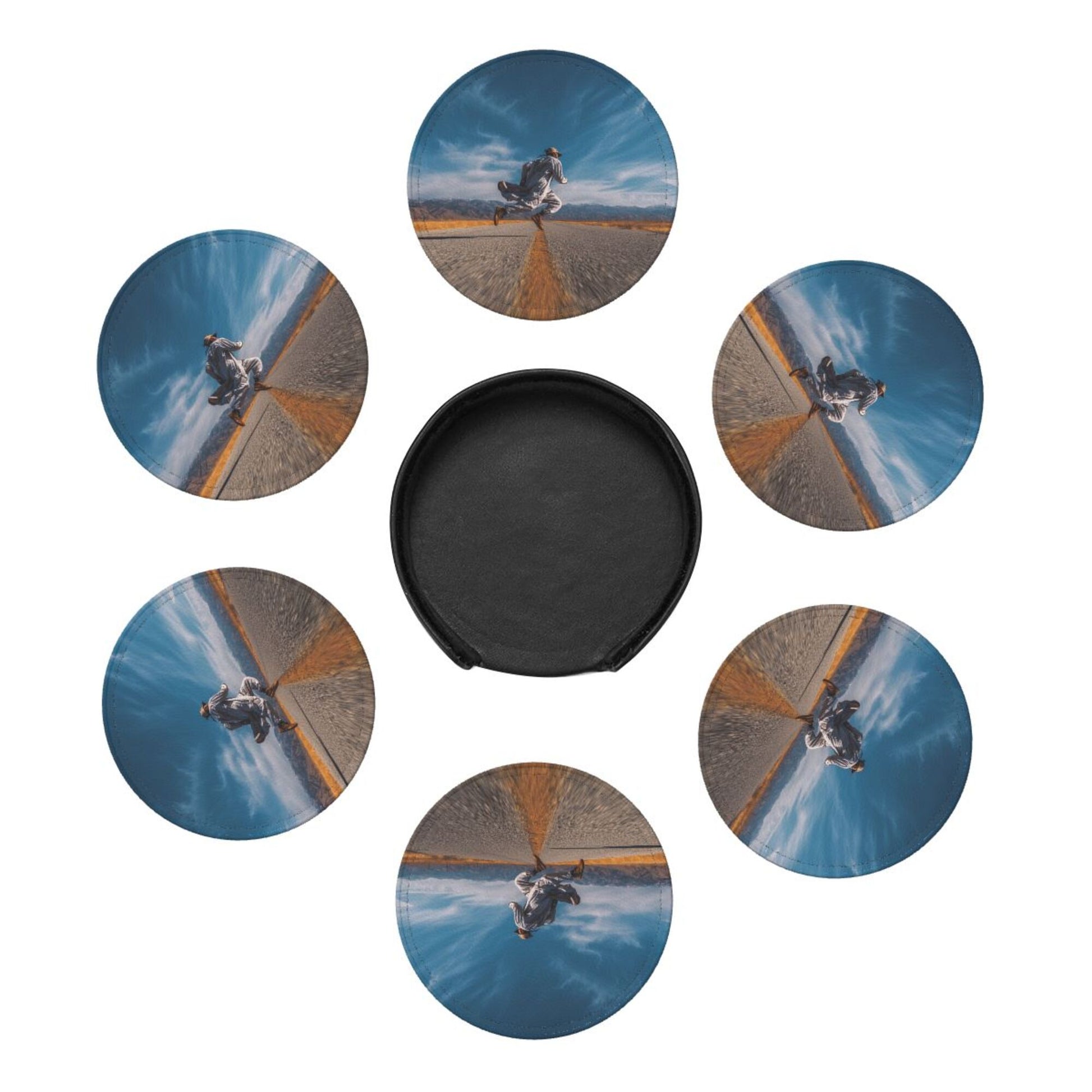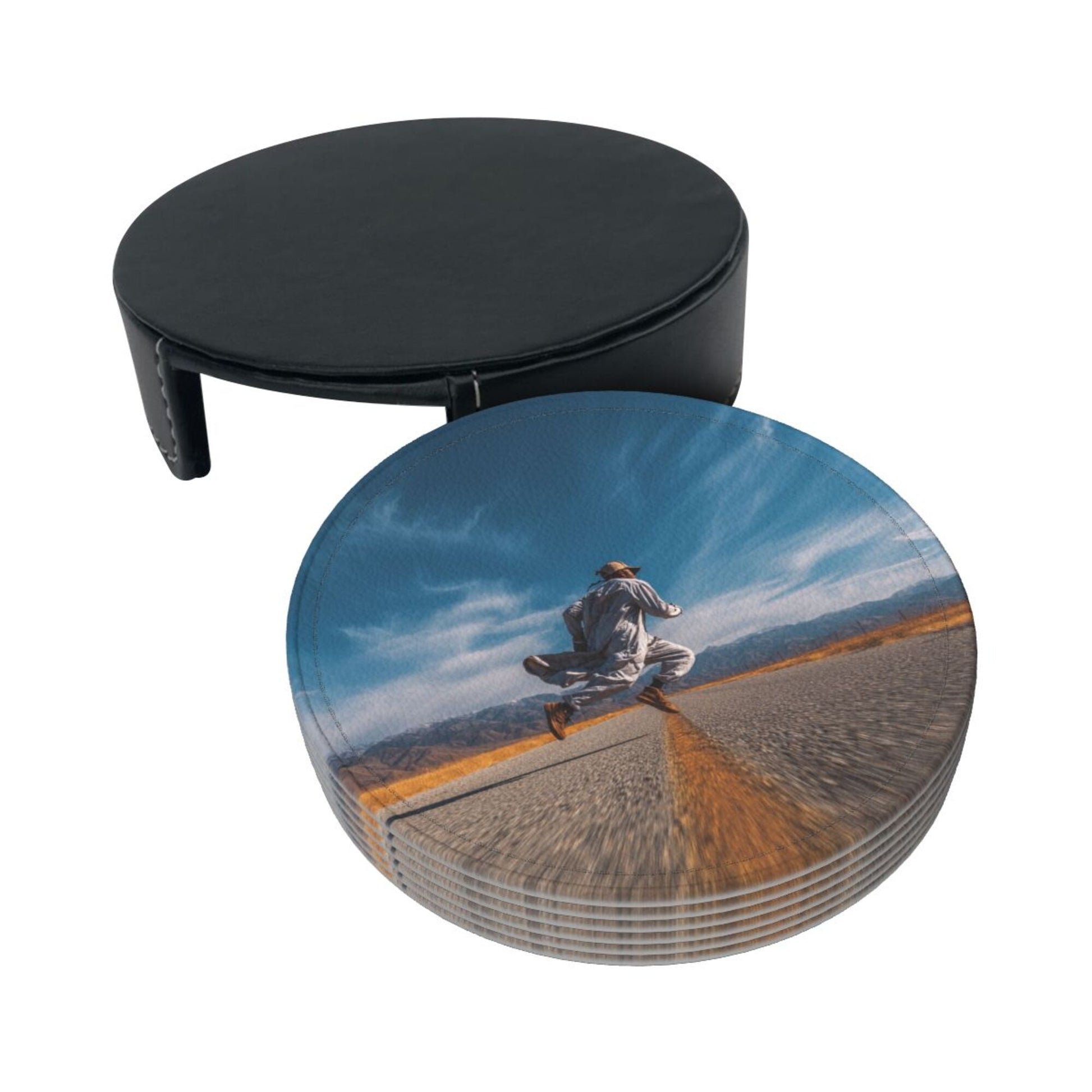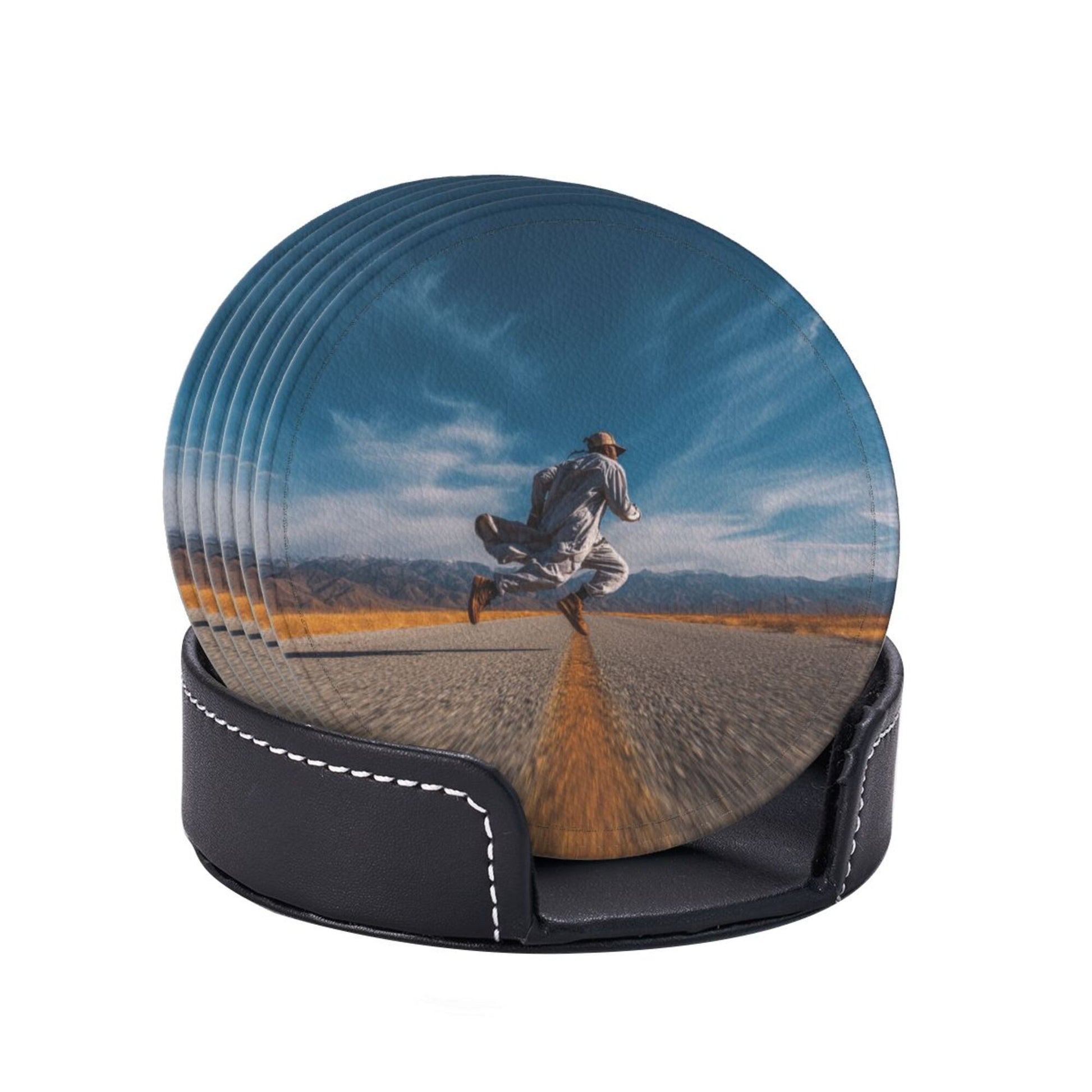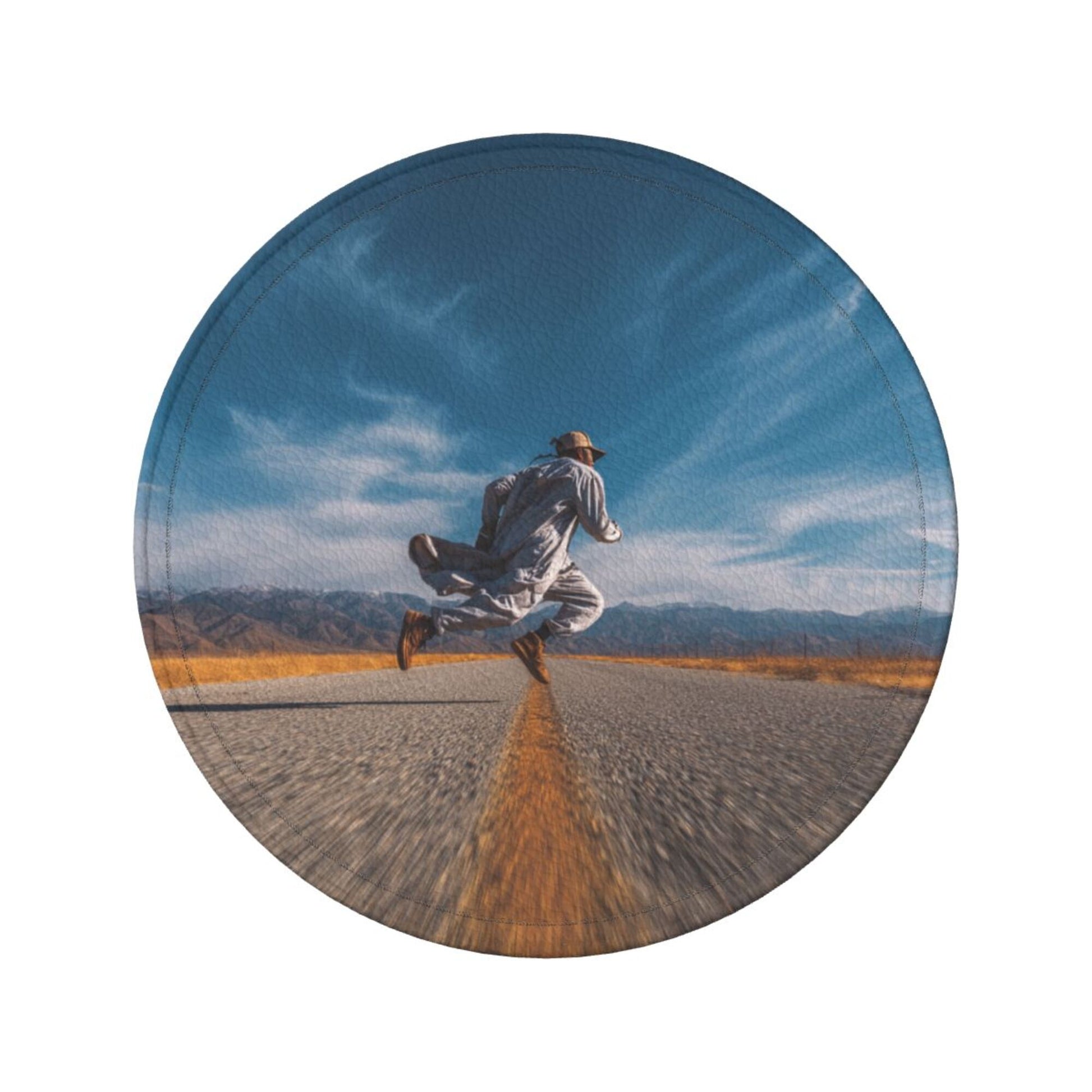 Artistic Pattern:The surface of the coaster presents a picture of “a figure leaping on an open road”. The combination of blue sky, wilderness, and road elements conveys a free - spirited attitude towards life. Placed on the dining table or bar counter, it adds a touch of casualness and vitality to the space, suitable for various home styles such as modern simplicity and industrial style, making the placement of tableware a small window to show personality.