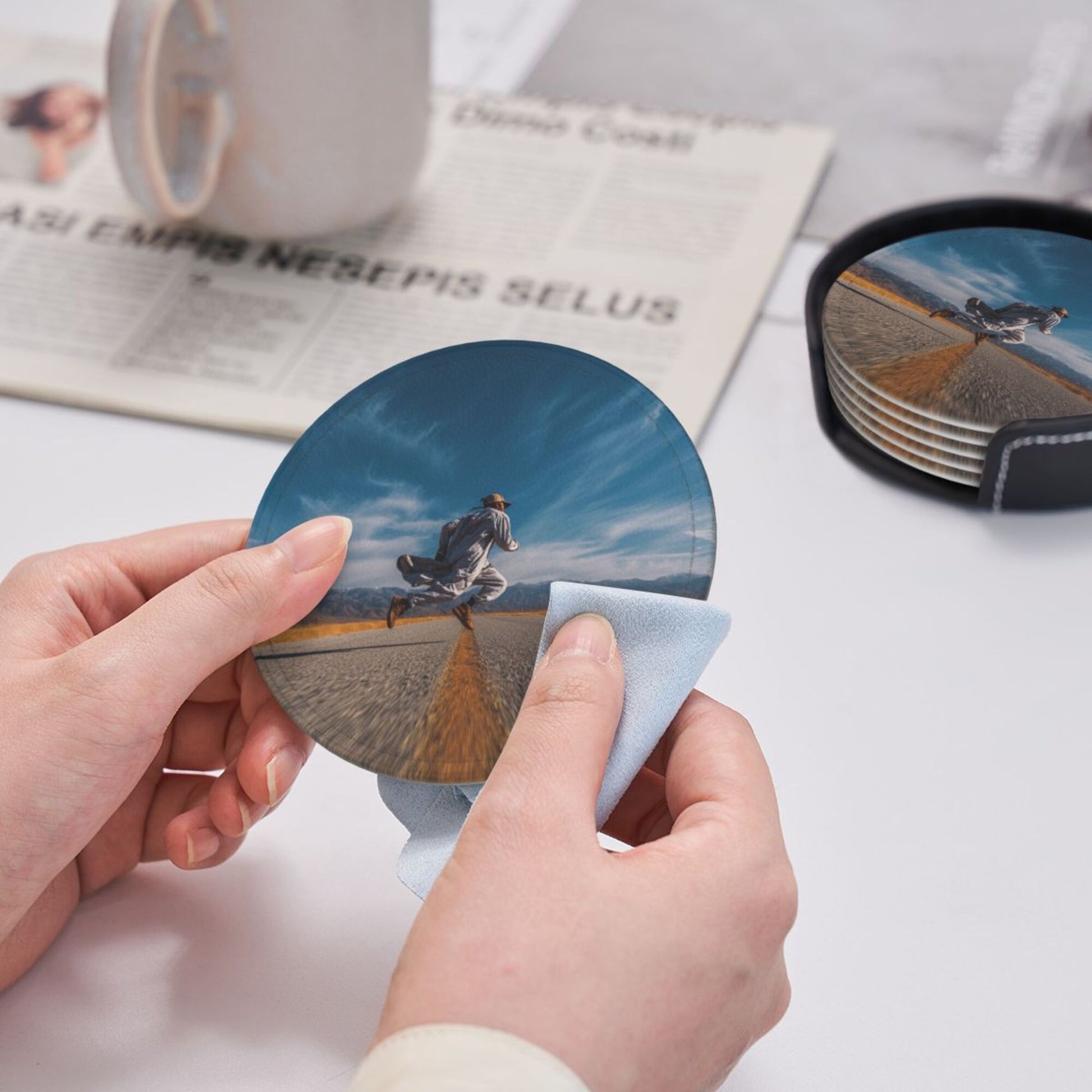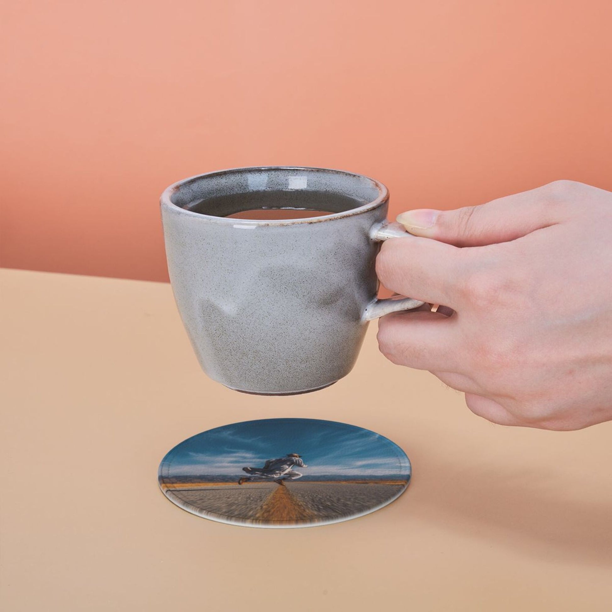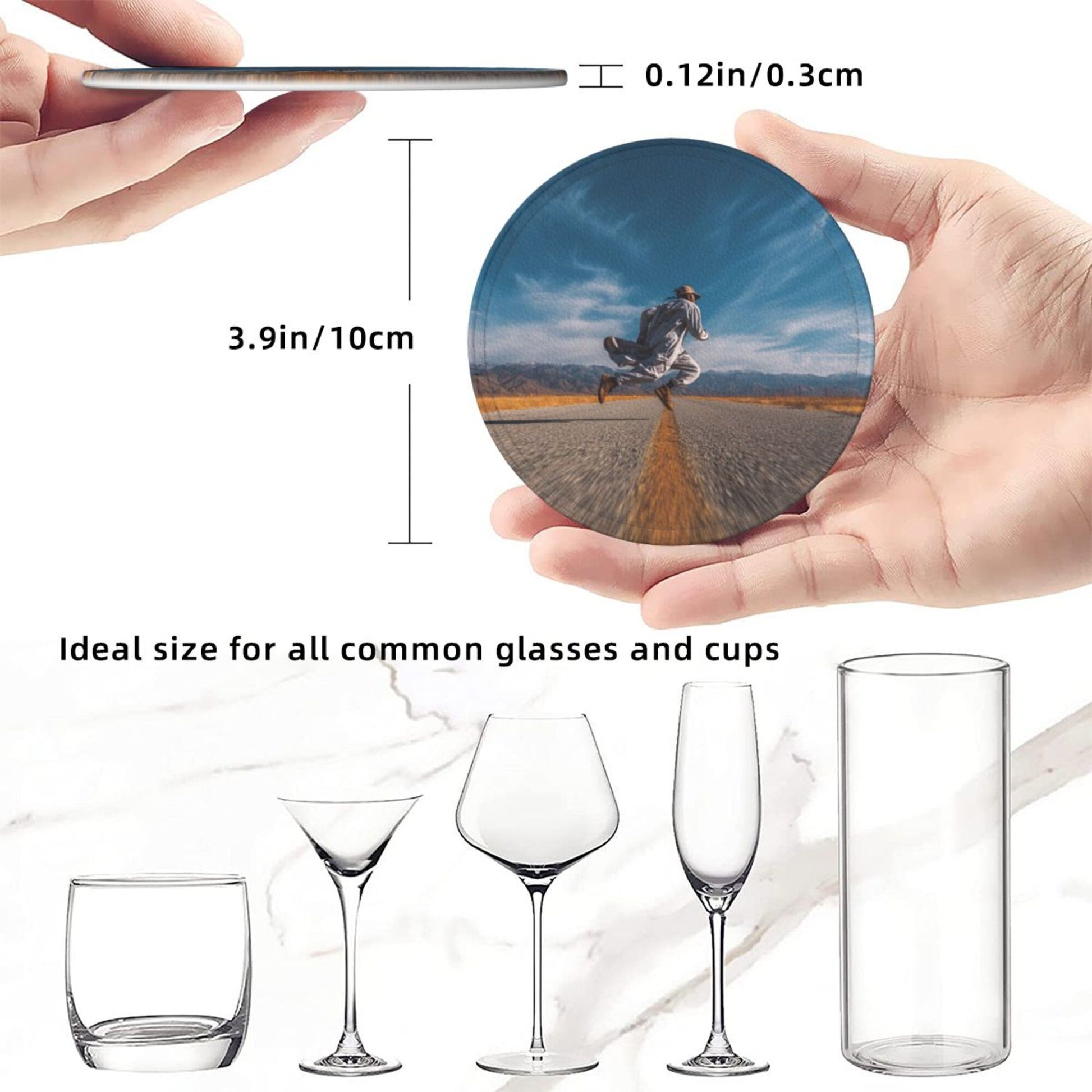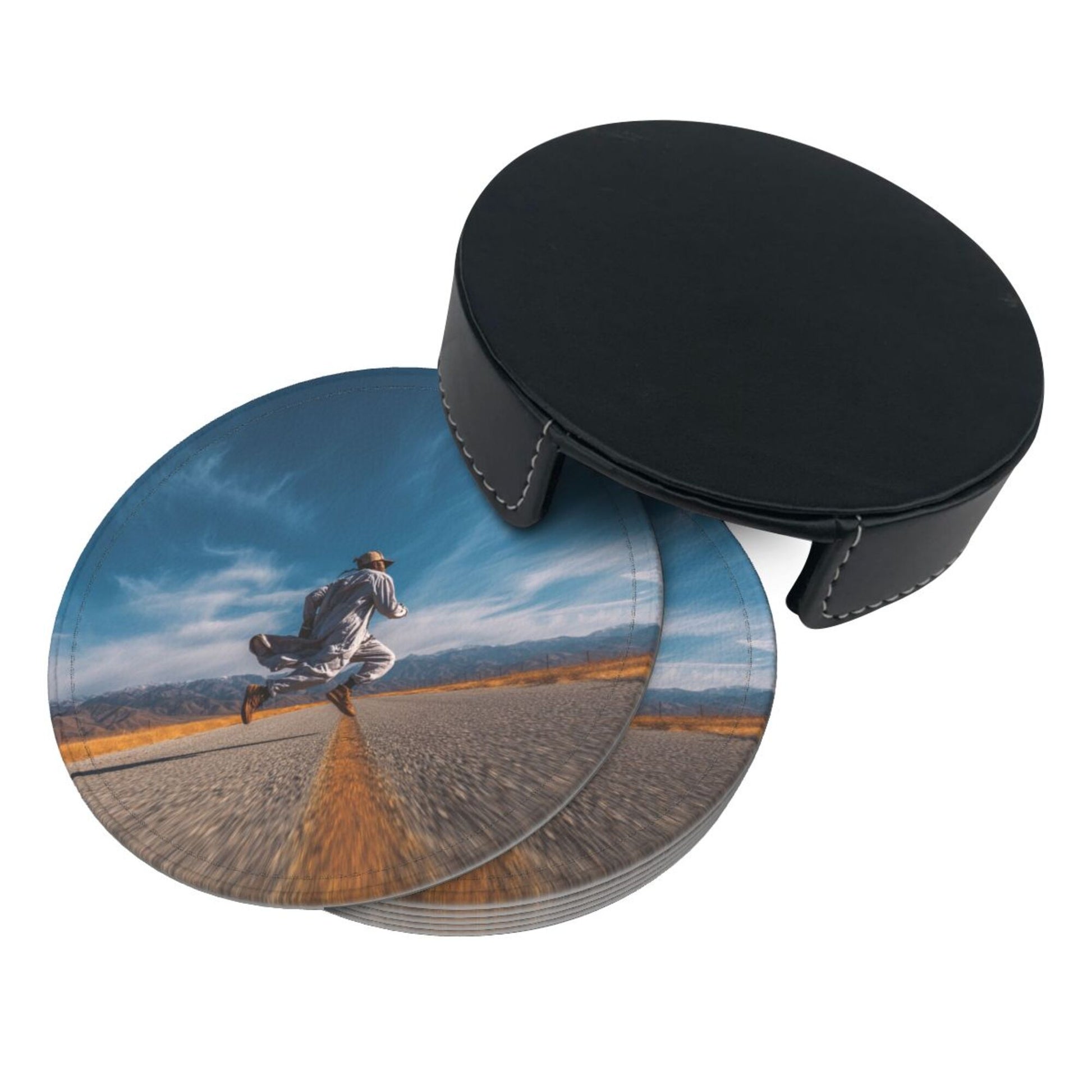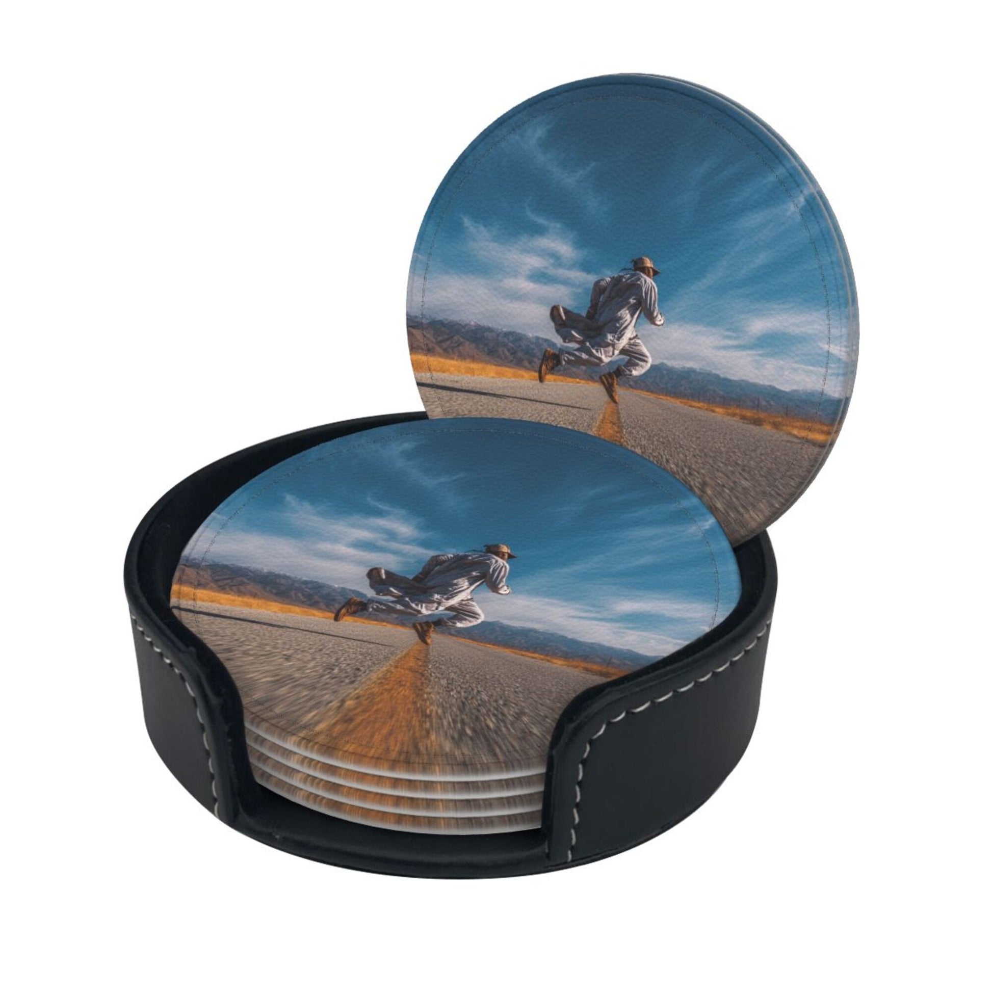 Artistic Pattern:The surface of the coaster presents a picture of “a figure leaping on an open road”. The combination of blue sky, wilderness, and road elements conveys a free - spirited attitude towards life. Placed on the dining table or bar counter, it adds a touch of casualness and vitality to the space, suitable for various home styles such as modern simplicity and industrial style, making the placement of tableware a small window to show personality.