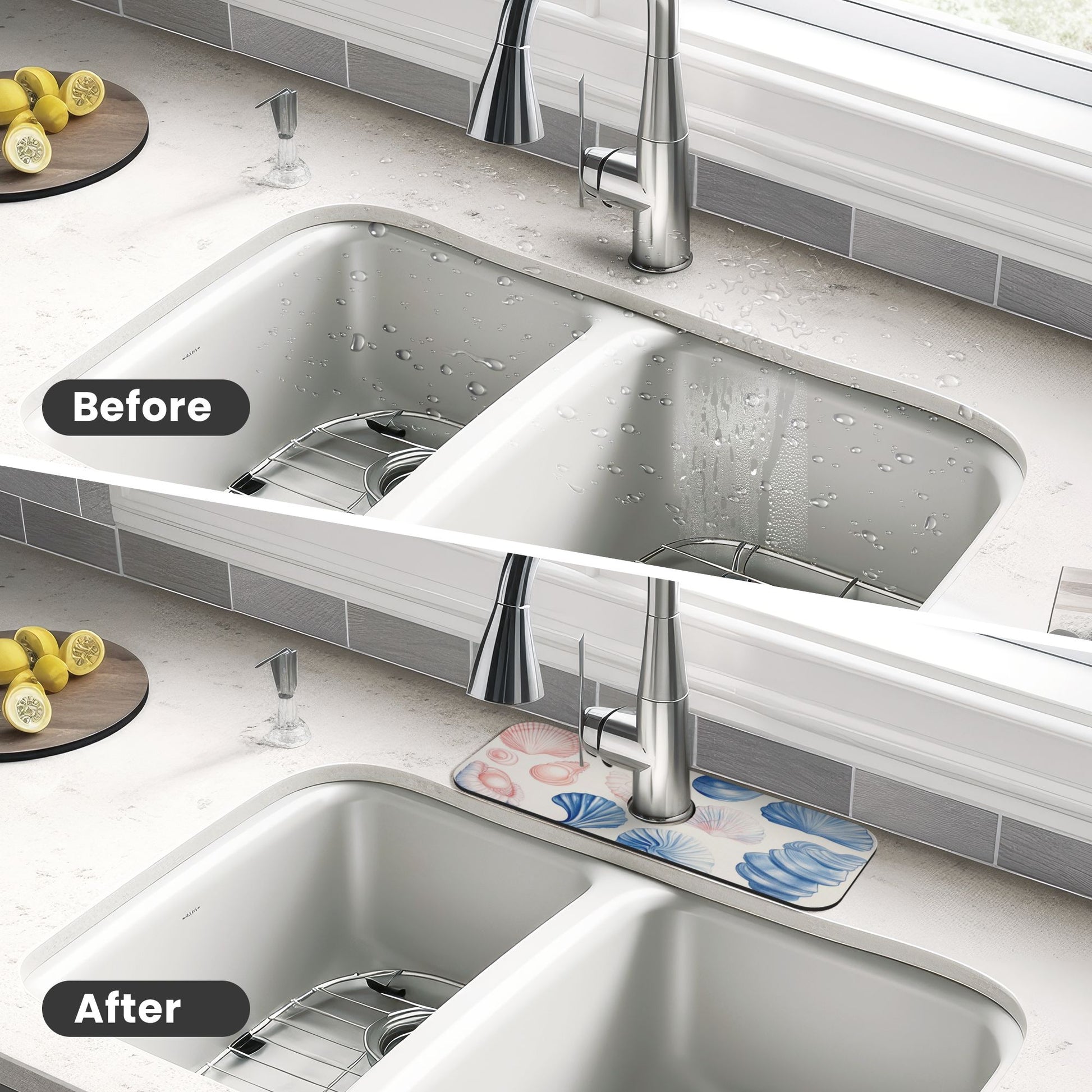 Ocean Shell Printed Faucet Absorbent Mat, Cuttable Anti - Slip & Waterproof Sink Mat (Size 15in×5.5in, Hole Diameter 2.5in )